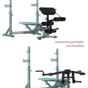 El Olympic Rack es un banco multiposición diseñado para ofrecer versatilidad en el entrenamiento de fuerza. Permite multiples ajustes para realizar ejercicos con el banco horizontal, inclinado o reclinado. Las barras son ajustables e incluye 2 J-hooks para posar una barra olímpica, también incluye 2 soportes de seguridad, que la convierten en un rack de sentadilla.